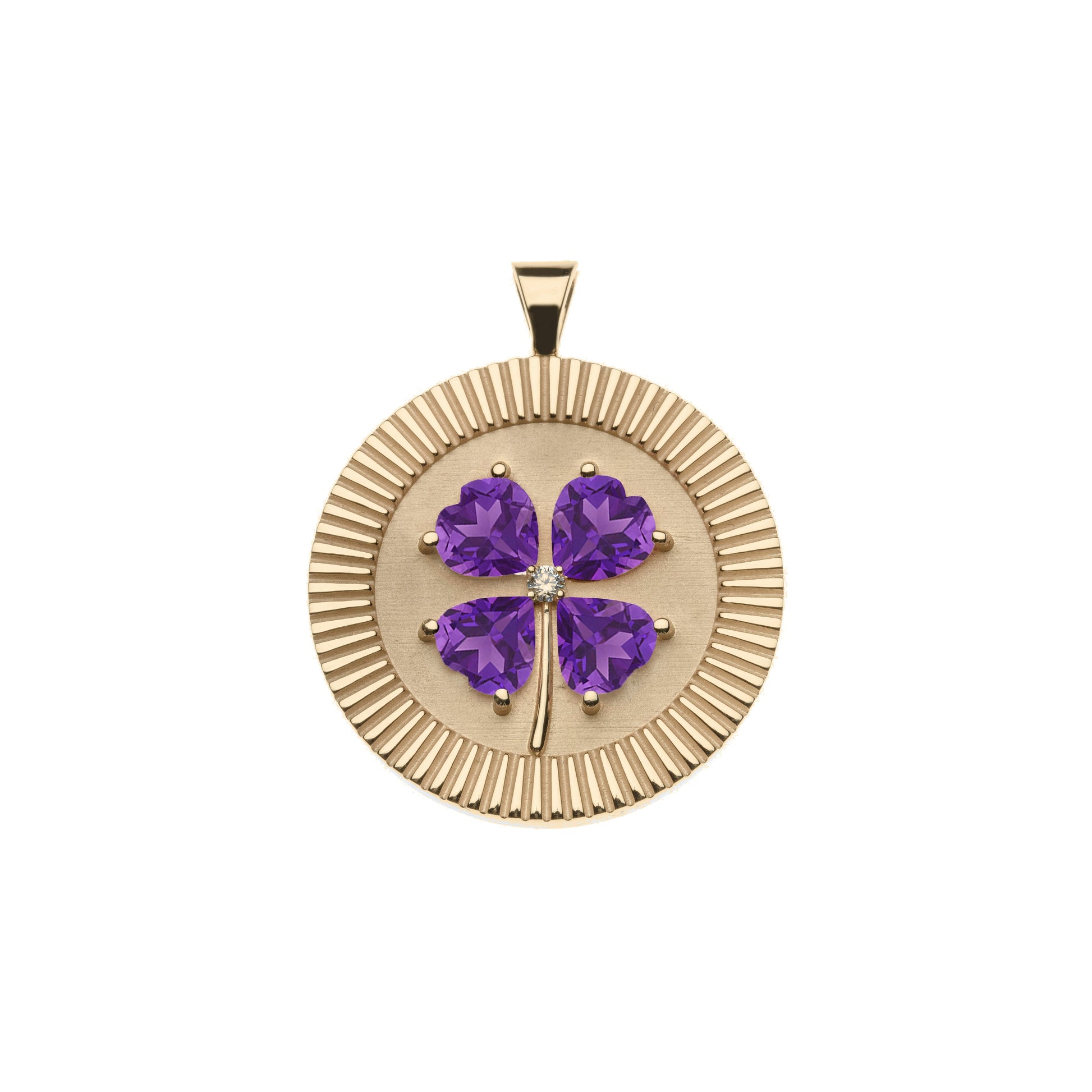 A very special fine jewelry version of our Original LUCKY coin. 14k gold with heart shaped amethyst stones, placed in the shape of a 4 leaf clover. Hand engraved on the back with ‘lucky’.