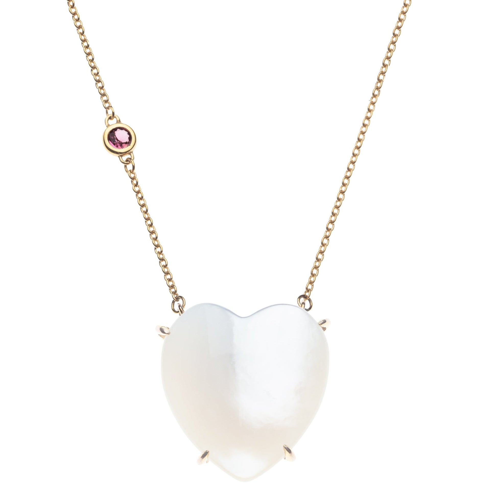 Statement carved mother of pearl shell heart pendant set in 10k gold and accented with pink tourmaline detail.
