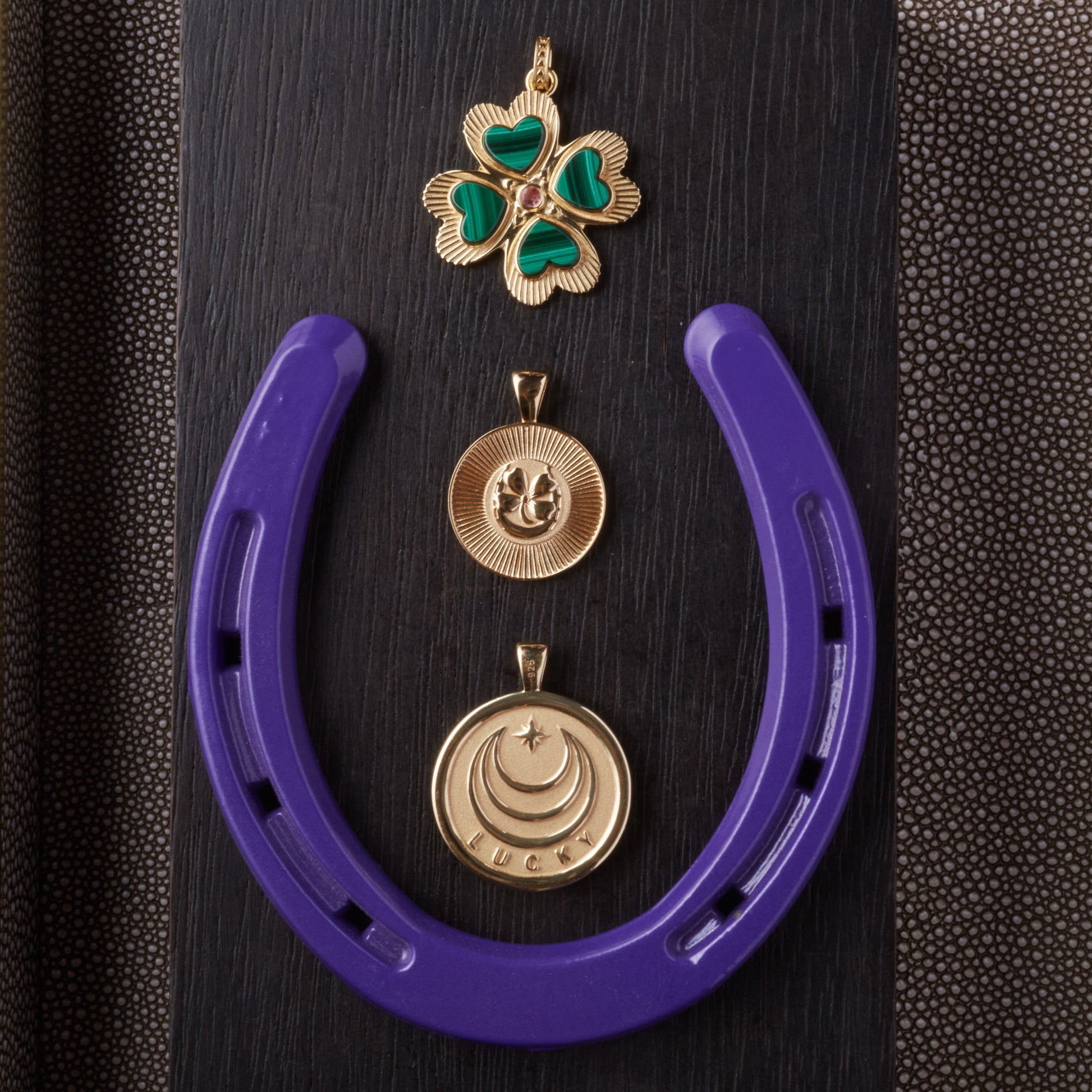 We like to think that optimism brings positivity around us, but sometimes good things just happen by chance, that's LUCK! Whether you are born with it or you are seeking more of it, being LUCKY comes in streaks. This pendant is adorned with a lucky four-leaf clover and a lucky horseshoe. Wear it as a daily touchstone to remind you to look for the positive and more positive will come your way!
